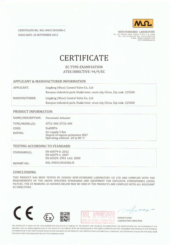 • Pneumatic Actuator CE Certificate